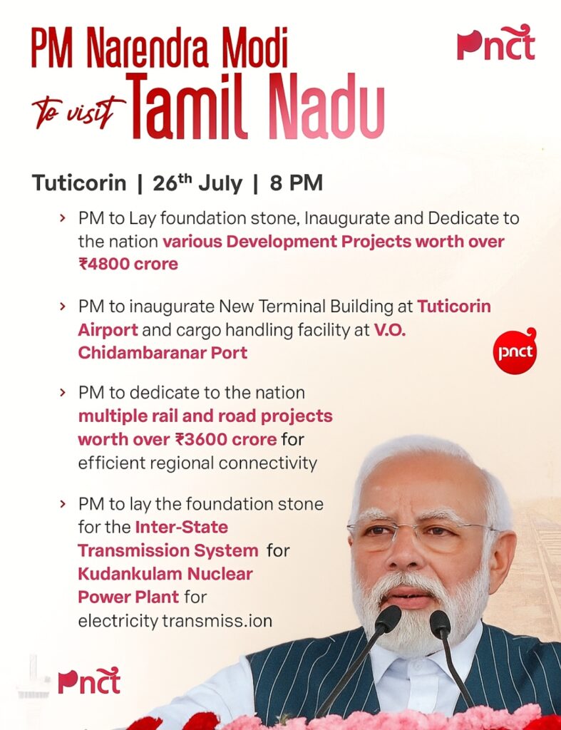 PNCT NEWS:-DHARMENDRA CHOUDHARYЁЯУН рддреВрддреАрдХреЛрд░рд┐рди, рддрдорд┐рд▓рдирд╛рдбреБ | 26 рдЬреБрд▓рд╛рдИ | рд░рд╛рдд 8 рдмрдЬреЗрдкреНрд░рдзрд╛рдирдордВрддреНрд░реА рд╢реНрд░реА рдирд░реЗрдВрджреНрд░ рдореЛрджреА 26 рдЬреБрд▓рд╛рдИ рдХреА рд░рд╛рдд 8 рдмрдЬреЗ рддрдорд┐рд▓рдирд╛рдбреБ рдХреЗ рддреВрддреАрдХреЛрд░рд┐рди рдкрд╣реБрдБрдЪреЗрдВрдЧреЗ, рдЬрд╣рд╛рдБ рд╡реЗ тВ╣4800 рдХрд░реЛрдбрд╝ рд╕реЗ рдЕрдзрд┐рдХ рдХреА рд╡рд┐рдХрд╛рд╕ рдкрд░рд┐рдпреЛрдЬрдирд╛рдУрдВ рдХрд╛ рд╢рд┐рд▓рд╛рдиреНрдпрд╛рд╕, рдЙрджреНрдШрд╛рдЯрди рдФрд░ рд░рд╛рд╖реНрдЯреНрд░ рдХреЛ рд╕рдорд░реНрдкрд┐рдд рдХрд░реЗрдВрдЧреЗредЁЯФ╣ рдкреНрд░рдзрд╛рдирдордВрддреНрд░реА рддреВрддреАрдХреЛрд░рд┐рди рд╣рд╡рд╛рдИ рдЕрдбреНрдбреЗ рдкрд░ рдирд╡рдирд┐рд░реНрдорд┐рдд рдЯрд░реНрдорд┐рдирд▓ рднрд╡рди рдФрд░ рд╡реА.рдУ. рдЪрд┐рджрдВрдмрд░рдирд╛рд░ рдмрдВрджрд░рдЧрд╛рд╣ рдкрд░ рдХрд╛рд░реНрдЧреЛ рд╣реИрдВрдбрд▓рд┐рдВрдЧ рд╕реБрд╡рд┐рдзрд╛ рдХрд╛ рдЙрджреНрдШрд╛рдЯрди рдХрд░реЗрдВрдЧреЗред